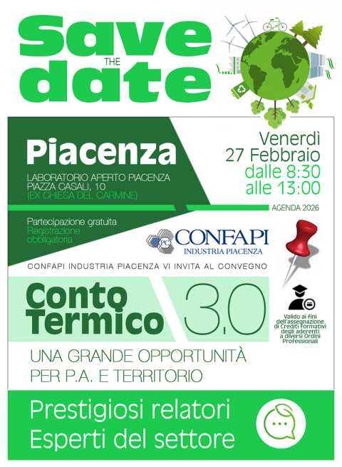 Venerdì 27 febbraio, dalle 8:30 alle 13:00, presso il Laboratorio Aperto di Piacenza (Piazza Casali, 10 – ex Chiesa del Carmine), si terrà il convegno “Conto Termico 3.0: una grande opportunità per P.A. e territorio”, promosso da Confapi Industria Piacenza.