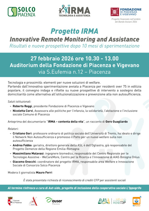 Venerdì 27 febbraio, dalle 10.30 alle 13.00, presso l’Auditorium della Fondazione di Piacenza e Vigevano (via S. Eufemia 12, Piacenza), si terrà il convegno finale del progetto IRMA – Innovative Remote Monitoring and Assistance, un’iniziativa sperimentale che integra tecnologia, prossimità e accompagnamento sociale a supporto degli anziani fragili.