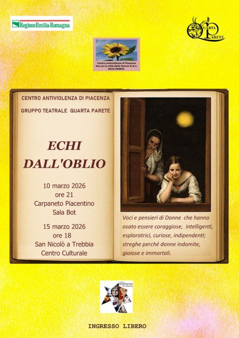 Il Centro Antiviolenza di Piacenza, in collaborazione con il Gruppo Teatrale Quarta Parete, presenta “Echi dall’Oblio”, uno spettacolo che porta in scena voci e pensieri di donne che hanno avuto il coraggio di sfidare il proprio tempo. Donne intelligenti, curiose, indipendenti, esploratrici, pioniere: figure che, nonostante l’oblio, restano indomite, gioiose e immortali.