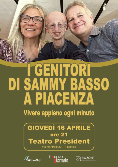 Stanno girando l’Italia raccontando la loro esperienza di vita: i genitori di Sammy Basso – il padre Amerigo e la madre Laura Lucchin – saranno protagonisti della serata “Vivere appieno ogni minuto” in programma a Piacenza giovedì 16 aprile alle ore 21 al teatro President in via Manfredi 30.