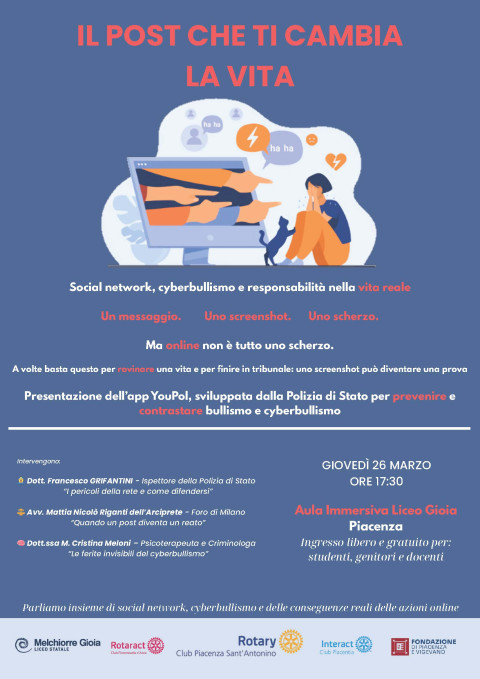 Un messaggio, uno screenshot, uno scherzo. Ma online non è tutto uno scherzo. È da questo messaggio diretto e attuale che nasce il convegno “Il post che ti cambia la vita”, promosso dal Rotary Club Piacenza Sant’Antonino, in collaborazione con Rotaract Fiorenzuola e Interact Placentia, i cui presidenti per l’anno rotariano in corso sono, rispettivamente , Simona Cogni, Alexander Rispo e Angela Rebecchi.
