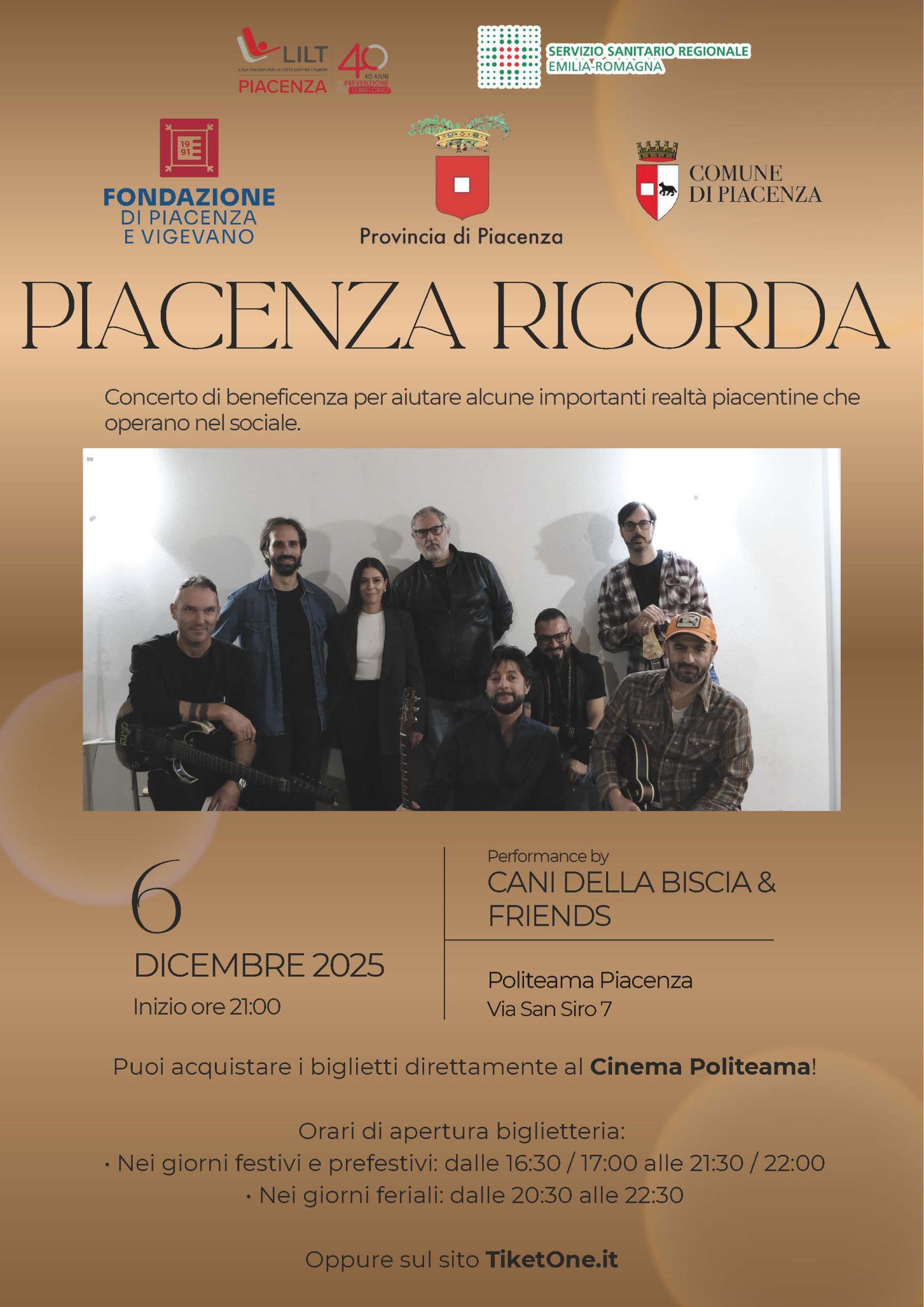 il 6 dicembre alle ore 21 presso il Teatro Politeama di Piacenza, la terza edizione dello spettacolo a scopo benefico “Piacenza Ricorda” promosso da C.S.E.N. Piacenza APS e Lilt Piacenza