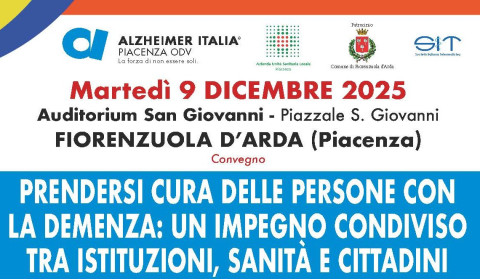 Martedì 9 dicembre 2025 presso l’auditorium San Giovanni – Piazzale S. Giovanni a Fiorenzuola d’Arda (Piacenza) – avrà luogo il convegno “Prendersi cura delle persone con la demenza: un impegno condiviso tra istituzioni, sanità e cittadini” promosso dall’associazione Alzheimer Piacenza ODV in collaborazione con Federazione Alzheimer Italia, Comune di Fiorenzuola d’Arda, AUSL di Piacenza e SIT (Società Italiana di Telemedicina).
