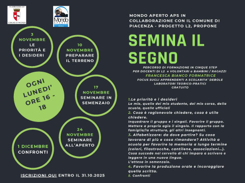 Gratuito, in collaborazione con il Comune di Piacenza, luogo da definire. In partenza lunedì 3 novembre