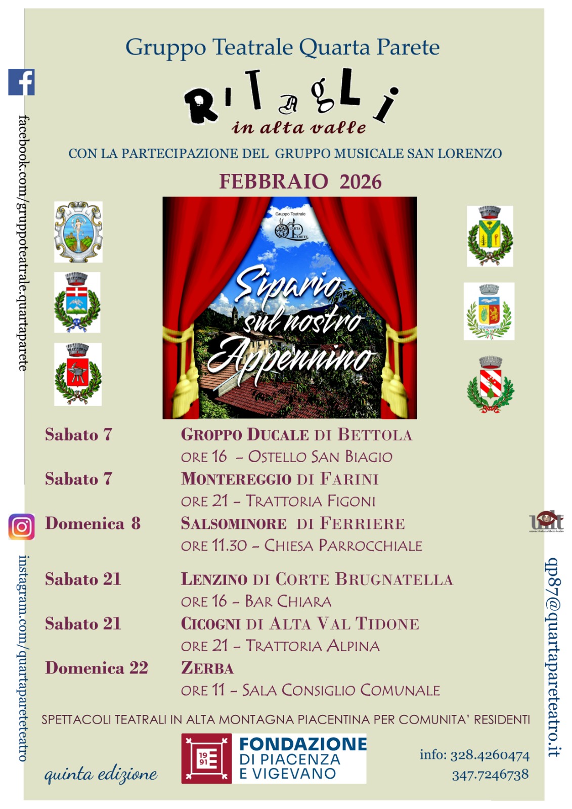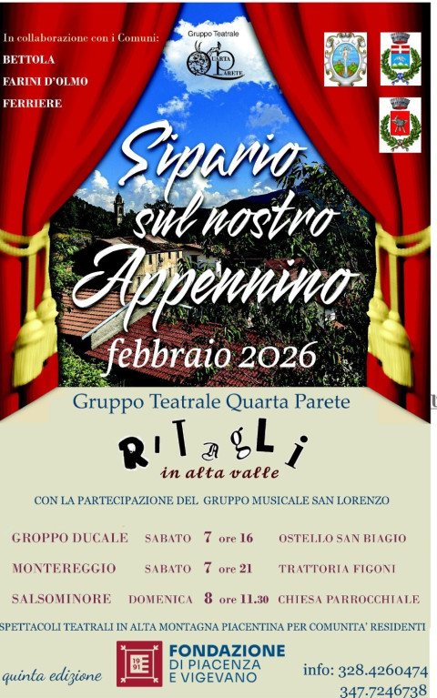 Anche nel febbraio 2026 il progetto Sipario sul nostro Appennino porta teatro, musica e danza nei piccoli borghi dell’alta valle, grazie al prezioso supporto e alla collaborazione della Fondazione di Piacenza e Vigevano e dei Comuni coinvolti.