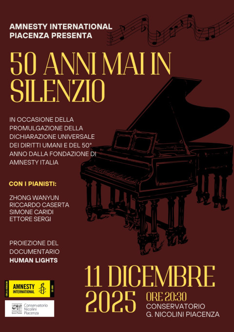 L’evento comprenderà la proiezione di un breve documentario sull’attività della sezione italiana ma soprattutto alcuni momenti che si inseriranno tra le esecuzioni musicali, in cui Amnesty International Piacenza vorrebbe condividere con voi associazioni e insegnanti (quindi dove possibile la presenza anche delle studentesse e degli studenti) un approfondimento sui diritti umani, sia per le attività che svolgete sia per quelle che avete condiviso reciprocamente negli anni di ottima collaborazione con Amnesty.