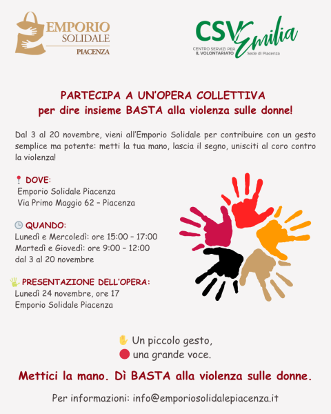 In occasione della Giornata Internazionale contro la Violenza sulle Donne, Emporio Solidale Piacenza e CSV Emilia invitano tutta la cittadinanza a partecipare alla creazione di un’opera collettiva